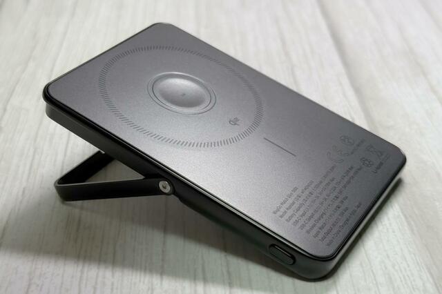ここまででも充分すぎるほど完成度の高いモバイルバッテリーですが、さらに驚かされたのが、背面に折りたたみ式のスタンドが内蔵されていること。