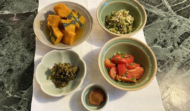 かぼちゃ煮、きゅうりとレタスの三杯酢、フルーツトマト、高菜漬け、梅干し、