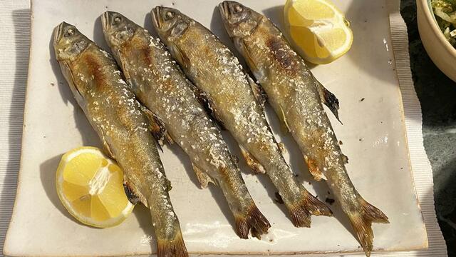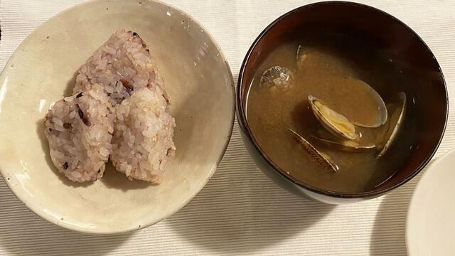もちきびご飯の焼き三角おにぎり、あさりの味噌汁。