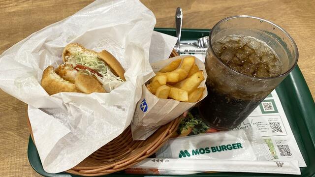 市場内のMOS BURGERで「バジルマヨのエビカツバーガー」のセット(フライドポテト+ペプシコーラ)。ひとかじりしてから撮影していないことに気がついた。お見苦しくてすみません。久しぶりのハンバーガー。美味しかった。セットで980円というお値段も素敵。