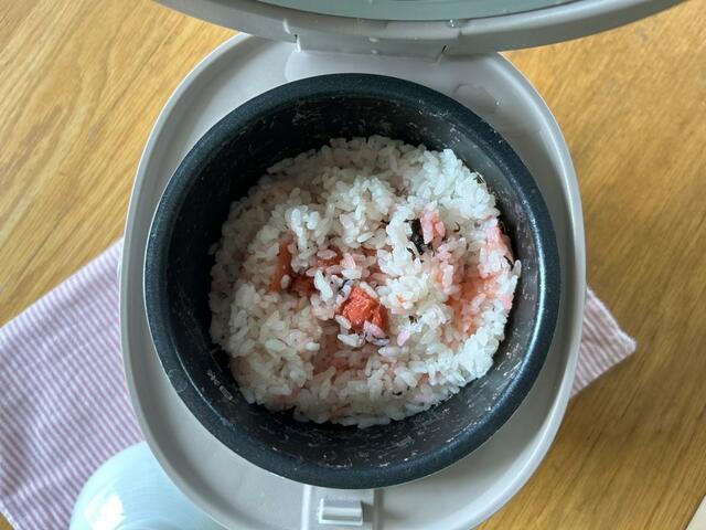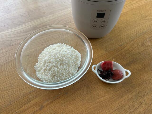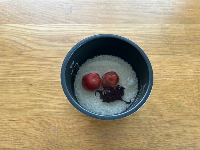 2.1に梅干しを入れて炊飯器をスイッチオン。あればシソも入れましょう。