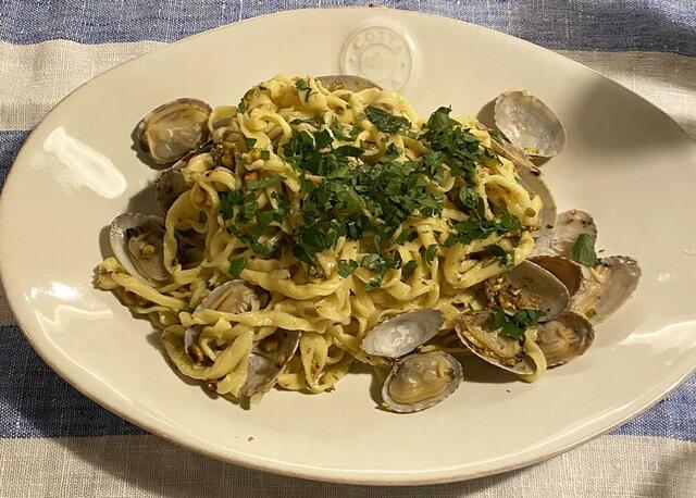あさりと砕いたピスタチオとパルミジャーノの生パスタ。スッキリさっぱりしたイタリア的食事。好きだな、こういうの。パイン君とバナナ。