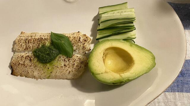 焼いたハモに塩、オリーブオイル、ジェノヴェーゼソース(ガルニチュールはきゅうりとアボカド。いい組み合わせでした)。