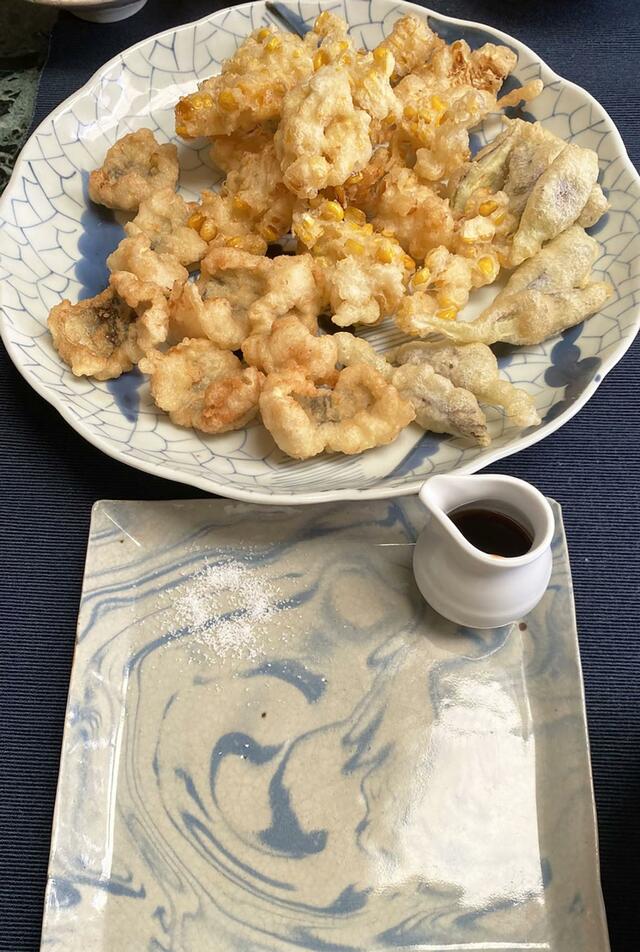 昨日市場で手に入れた「ハモ」とトウモロコシとミョウガを天ぷらに。