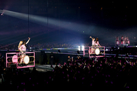 次のVCRにはEXOのスホとチャンヨルも登場。少女時代のファン(という設定)のスホが、少女時代のメンバーとの甘い妄想をするという、ファンタジー映像に会場が沸くと、この世界観のままメンバーはピンクの列車に乗って登場。メンバーごとに違うカラーの衣装で、頭に大きなリボン、手には大きなキャンディ。まるで漫画の世界から抜け出てきたような可愛らしさで『My Oh My』をコミカルに披露。そして、フロートに乗り込み、アリーナ後方のサブステージを往来しながら『Kissing You』『FLYERS』『LOVE & GIRLS』『Blue Jeans』を立て続けにパフォーマンスして会場を沸かせ一体感に。その一体感をさらにまとめ上げるかのようにセンターステージで『Gee』を披露すると、会場は大歓声で沸いた。