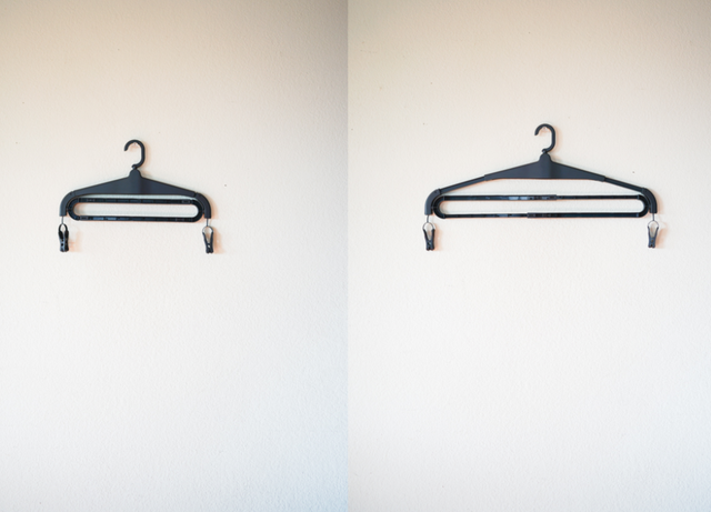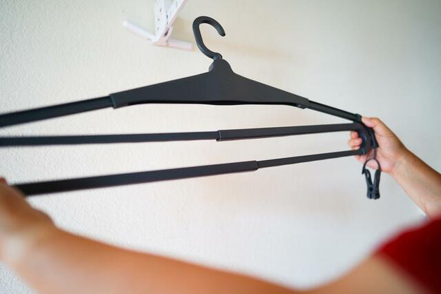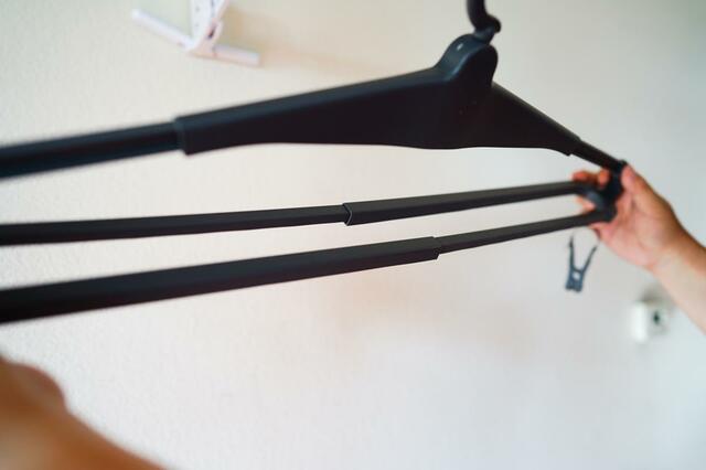 普通のハンガーのように見えますが、アームがビューっと伸び、干し幅が約34cmから61cmまで拡張。
