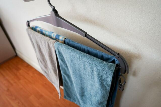バスタオルは幅があるため、普通のハンガーに干してもピーンと伸ばせず乾きにくかったのですが、「伸縮アーム」のお陰でシワなく干せるようになりました。
