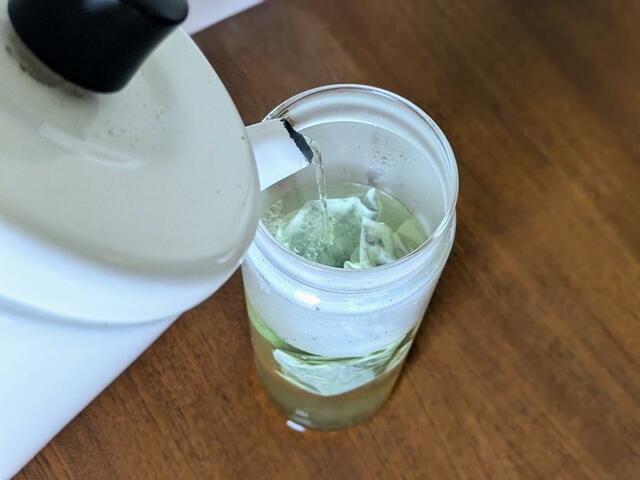 ティーバッグ3パックをボトルに入れて、750mlの少しぬるめのお湯(80〜90℃)を注ぎます。