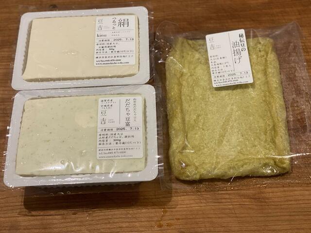 豆吉の3品(だだちゃ豆富、つるっと絹、秘伝豆の油揚げ)のうち、だだちゃ豆富は塩で、秘伝豆の油揚げは焼いただけで(大根おろし、生姜おろし、醤油)。