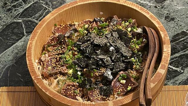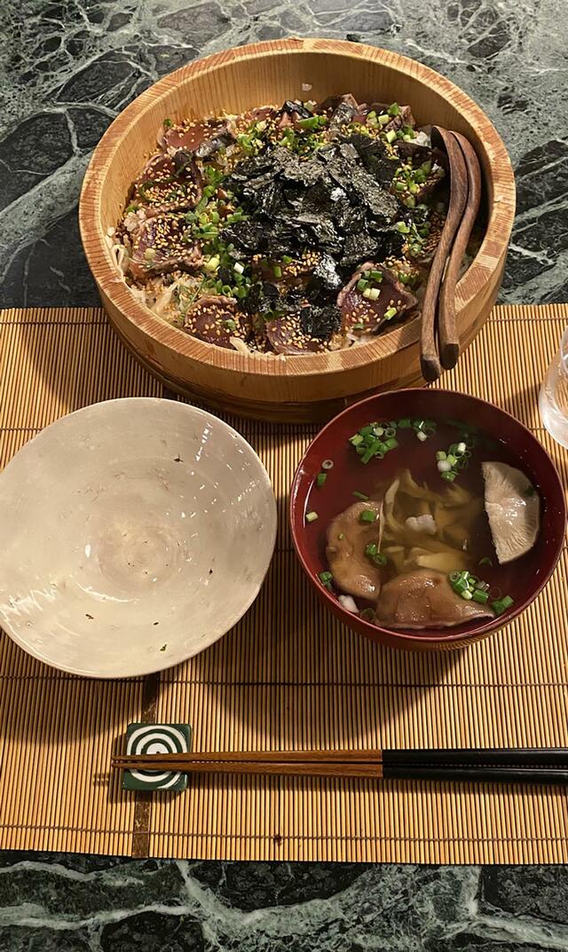 先日取り寄せた「明神丸」のカツオで「手こね寿司」を作った。鰹のタタキもうまいが、てこね寿司もうまいものです。しいたけと舞茸のお吸い物、上品味に仕上がりました。