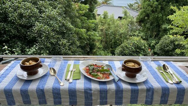オニオングラチネ(爽やかな風を肌に感じながらの熱々グラチネ、美味しい)。サラダはトマトときゅうりとチーズとバジル。