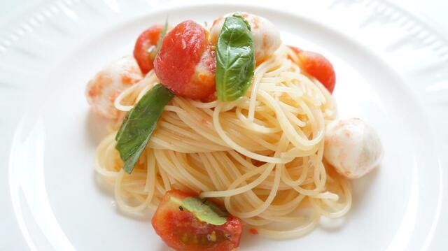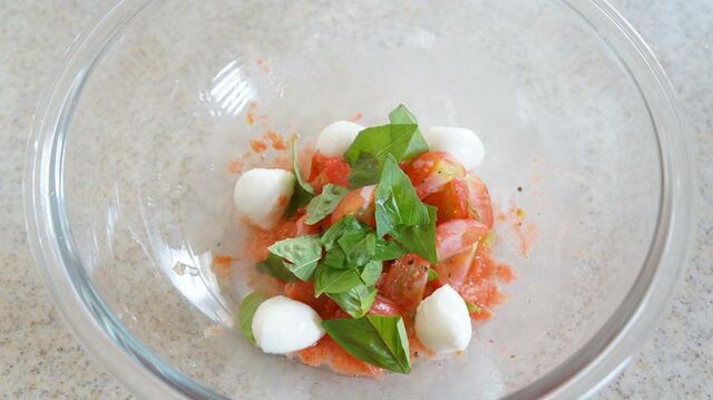 2. ボウルに手順1のトマトとモッツァレラチーズ、ちぎったバジル、オリーブオイルをざっくりと混ぜ合わせ、塩、黒こしょうで味を調える。カペッリーニを加えて混ぜ、器に盛り付けてできあがり。