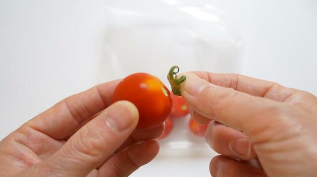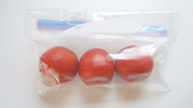 トマトやミニトマトを冷凍するときは、洗ってからヘタをとり、丸ごとジップロックに入れて冷凍庫で凍らせればOK。