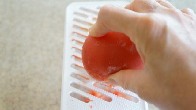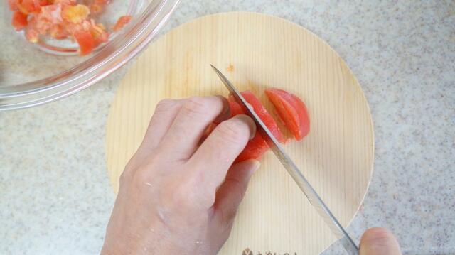 1. カペッリーニはパッケージの表記に従って茹で、冷水でしめる。冷凍トマトは凍ったまますりおろし、冷凍ミニトマトは2〜4等分にカットする。