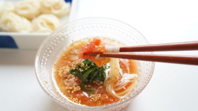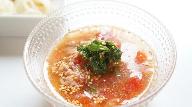 冷凍トマトを凍ったままそうめんのつけ汁に! キンキンに冷えたつゆが麺にからんで、食欲のないときにもツルツルっと食べることができる、筆者イチオシレシピです。