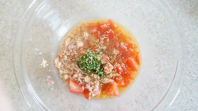 2. ボウルに手順1の冷凍トマトと大葉、軽く汁気を切ったツナ缶、めんつゆ、水、ごま油、白ごまをボウルに加えて混ぜ、器に盛り付けてできあがり。