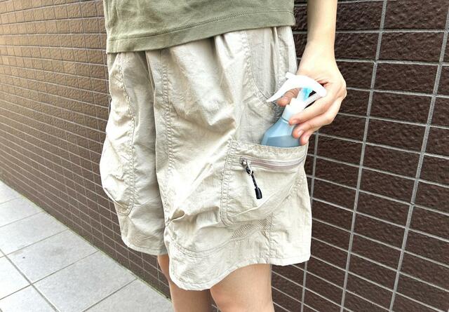 浅めと書いたポケットも、虫除けや日焼け止めの小さめのスプレーボトルくらいなら余裕で入ります。