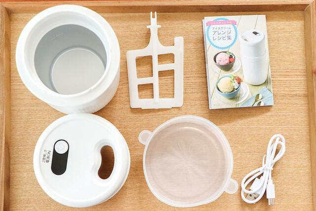 充電用のUSBコードと保冷容器に被せるカバー、アレンジレシピ集が付属します。