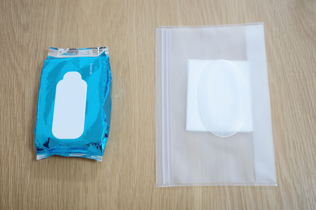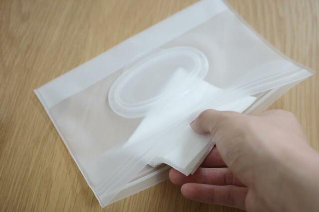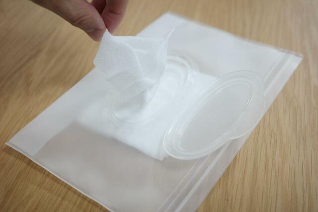 市販のウェットシートを必要な分だけ詰め替えて持ち運ぶことができるんです。