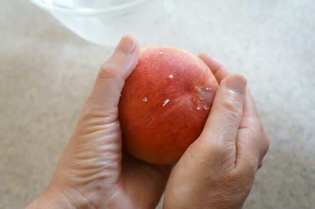 1. 桃は種を取り除き、皮付きのままカットする。表面の産毛が気になる場合は、塩を振って軽く表面をこすり、洗い流す。