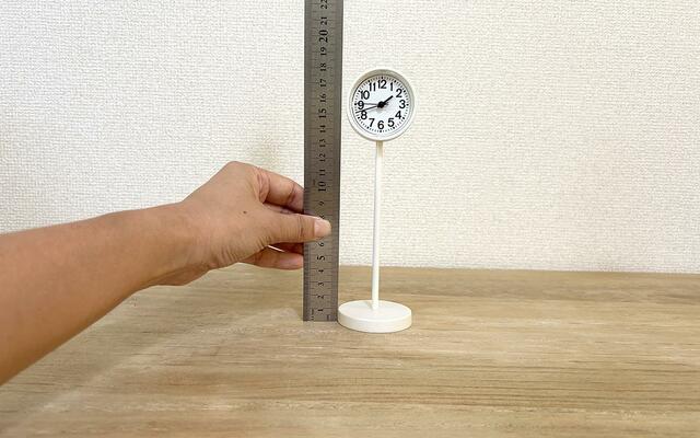 高さはだいたい18cm、土台部分も直径5.5cmくらいで、とってもスリムでコンパクト。また秒針はチクタクするステップ秒針ですが、秒針音はうるさくなく、個人的には音が気になることはほとんどありません。
