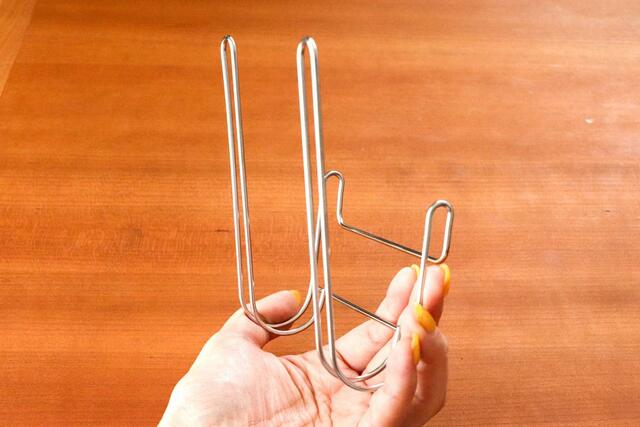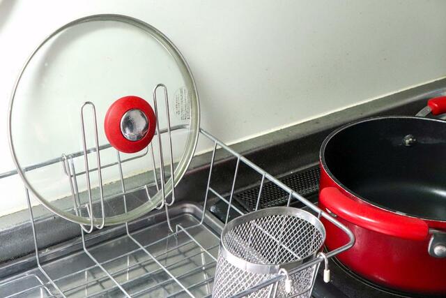 2本のフックがあるおかげで、丸いフタでも安定して立て掛けられるのがいいんですよね。