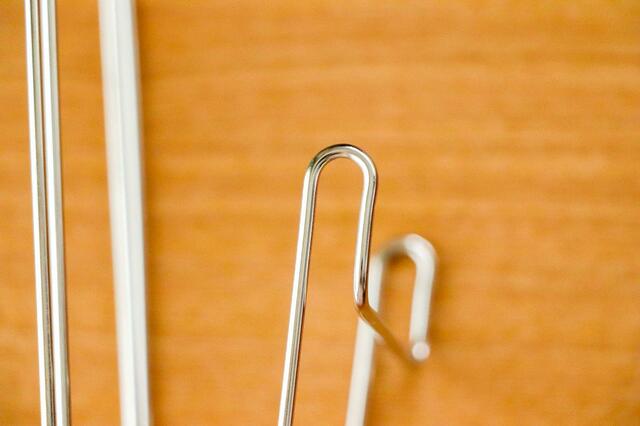 水筒を支えるパーツは、一般的なフックと比べて細長くなっています。長さがあるぶん、細長い水筒なども安定してかけられそうです。