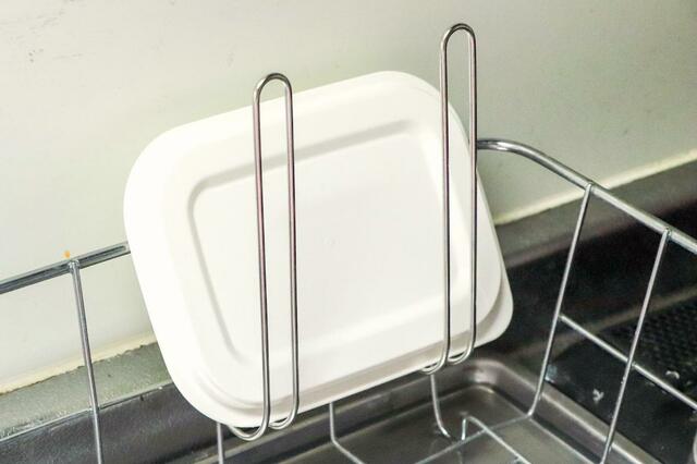 水切りカゴの隙間から落ちてしまいがちな保存容器のフタや小皿なども、安定感抜群で引っ掛けられます。