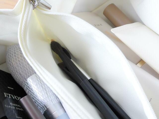 中の仕切りには4つのポケットがついていて、長めのコームや試供品、メイクブラシ、ヘアアクセなどを用途別に仕分けられます。