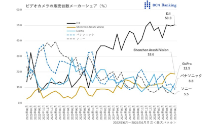 オズポケ3の販売台数シェアは23年11月以降、一度も20%を割り込んだことがない。さらに、ここにきて勢いづいており、5月には33.8%、6月には34.1%と2カ月連続で過去最高シェアを更新した。メーカー別でも同様だ。オズポケ3を世に送り出したDJIは23年11月、33.0%のシェアを獲得。一気にトップシェアに上り詰めた。その後、勢いを増しながらダントツを維持している。この6月は50.3%と過半を占める独走。まさにDJI無双、オズポケ3無双の状態だ。オズポケ3の登場でビデオカメラ市場も一気に活気づいた。それまで前年並みから前年割れの水準で低迷していたが、23年10月以降21カ月連続で前年超えを継続。市場全体を押し上げている。