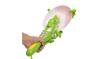最大直径220mm、深さ60mm以下の円形食器に対応。箸やフォークなどは直接本体の回転するスポンジ部分で洗浄できる。洗剤をブラシに付けて挟んでボタンを押すだけで、長時間手に洗剤水を付けないで楽に洗える。本体にストラップが付いていて、使わない時はキッチン周りのフックにかけて収納できる。