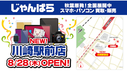 じゃんぱらは8月28日に、同社の展開するスマートフォン・PCの買取・販売「じゃんぱら」の新店舗として、「じゃんぱら川崎駅前店」(神奈川県川崎市)をオープンする。同店は、川崎市内における2店舗目の出店となり、20年以上の営業実績のある「じゃんぱら川崎店」との2店舗体制によって、川崎市のデジタルライフをサポートしていく。