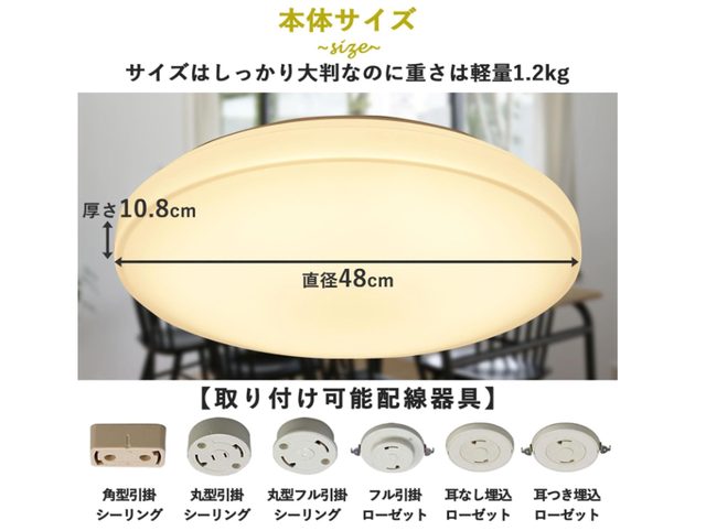 重量は約1.2kgと軽量・薄型設計で、一般的な引掛シーリングに対応し簡単に取り付けることができます。