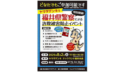ヤマダホールディングスは8月2日13~16時に、福井県警察による詐欺被害の防止に向けた取り組みに賛同して、「詐欺被害防止イベント」をヤマダデンキ テックランド福井本店(福井県福井市)にて開催する。参加費は無料。