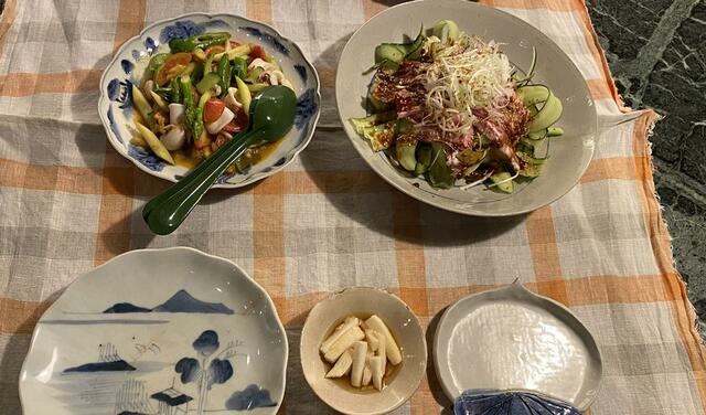 雲白肉(きゅうり、ゆで豚、白髪ねぎ、辛いソース)、アスパラガスとケンサキイカのにんにく炒め(トマトと万願寺をプラス)。TORU君作の花巻。