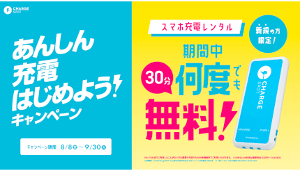 モバイルバッテリーのシェアリングサービスを始めるきっかけとなるよう、キャンペーン期間中、新規ユーザー(8月7日までに利用経験のない人)に限り、1回30分未満なら何度でも無料で利用できる。エントリーは不要で、自動適用される。ただし、一部のテーマパークなどは対象外。