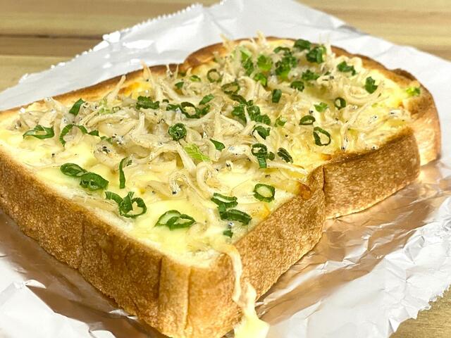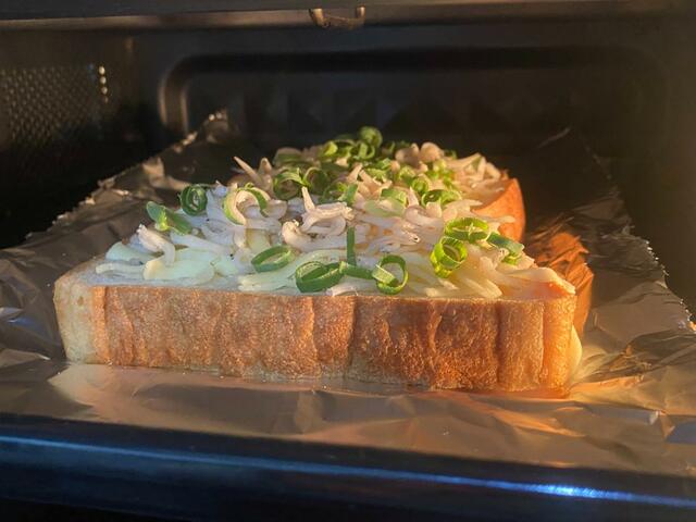 食パンにしらすとピザ用チーズ、小ねぎをのせて、あとはトースターにおまかせ。