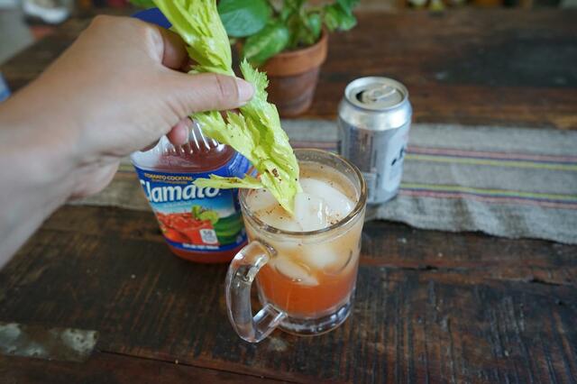 家でパーティーをするときなど、ちょっとオシャレにアレンジするなら、ビールグラスの淵にライムを塗り、そこにタヒンを付けて、マドラーをセロリにするとバーのようなミッチェラーダになります。