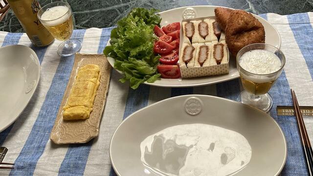 まい泉のカツサンド、SUZUKIYAのカレーパン、トマト、レタス、だし巻き卵、ビール、