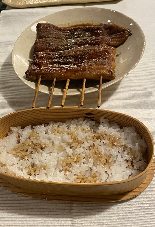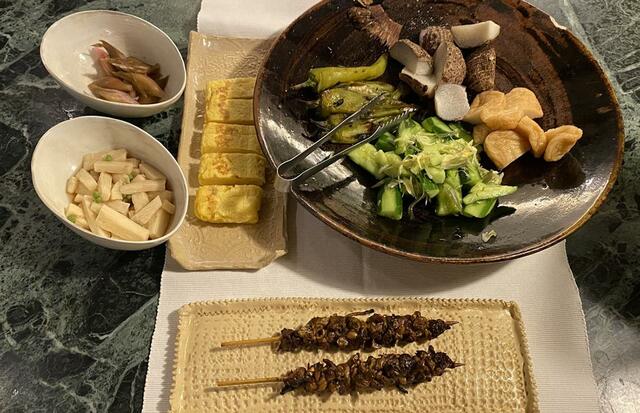 ミョウガの甘酢漬け、長芋のあごだしづけ、叩きキュウリ、茹で里芋(庭で収穫)、満願寺焼き、さつま揚げ、だし巻き卵。鰻の肝焼き、