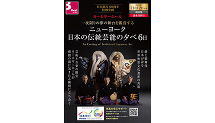 ニューヨーク公演のツアー「120周年記念 日本の伝統芸能の夕べ ニューヨーク6日」の出発日は11月12日(羽田発)で、日数は4泊6日となる。ホテルは、「ニューヨーク・マリオット・マーキース(デラックスルーム)」。利用航空会社は、日本航空(日本発着)。旅行代金(2人1室利用時の1人分)は、エコノミークラスが69万9000円、ビジネスクラスが155万9000円。燃油サーチャージや空港諸税は別途必要。最少催行人員は10人。