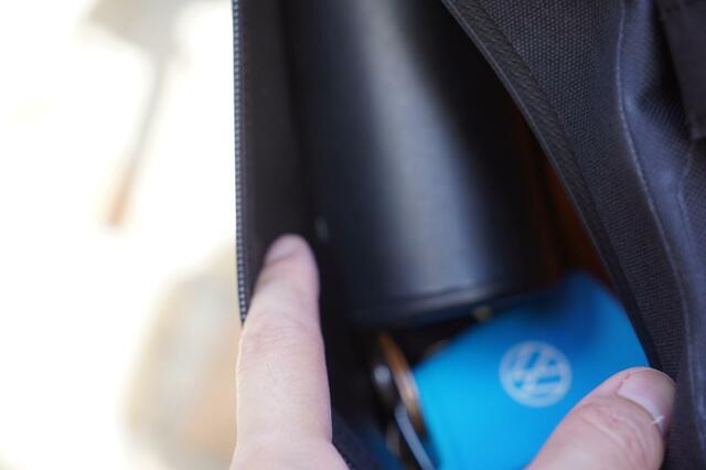 フレームの空いた部分を収納にしているので、それほど多くのものが入るわけではありませんが、財布やカギ、小ぶりな水筒を入れてもまだ少し余裕があるくらいには容量があります。最大容量は約1.8リットル。