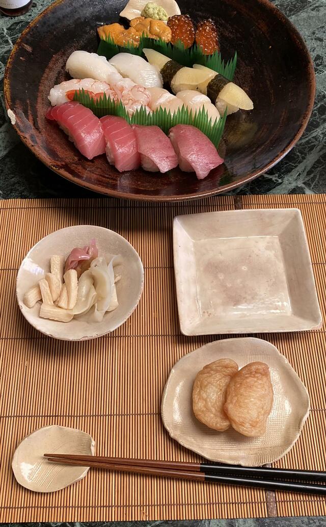 鈴木水産のにぎり寿司、ガリ、長芋の漬物、ミョウガの甘酢漬け、さつま揚げ。にぎり寿司は16貫で1880円。ネタgoodです。美味しいです。