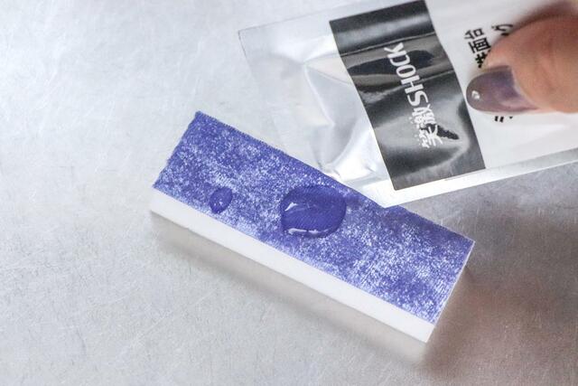 付属のスポンジにコーティング剤を染み込ませます。1円玉程度の少量ずつでOK。