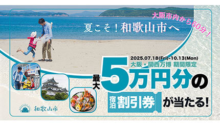 同キャンペーンでは、和歌山市内に宿泊して、観光ポータルサイト「わかやまあそび」へ旅の写真やツアー情報を投稿した人の中から抽選で100名に、次回使える宿泊割引券(最大5万円分。利用期間は11月1日~2026年2月15日)をプレゼントする。