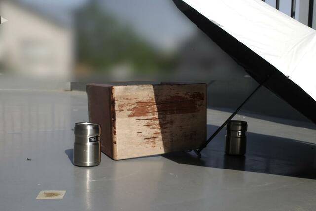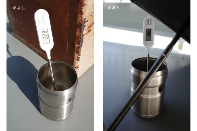 そこで、直射日光の当たる場所に2つのステンレスマグを5分間設置し、傘の有無で表面温度にどれだけ差が出るか検証してみました。