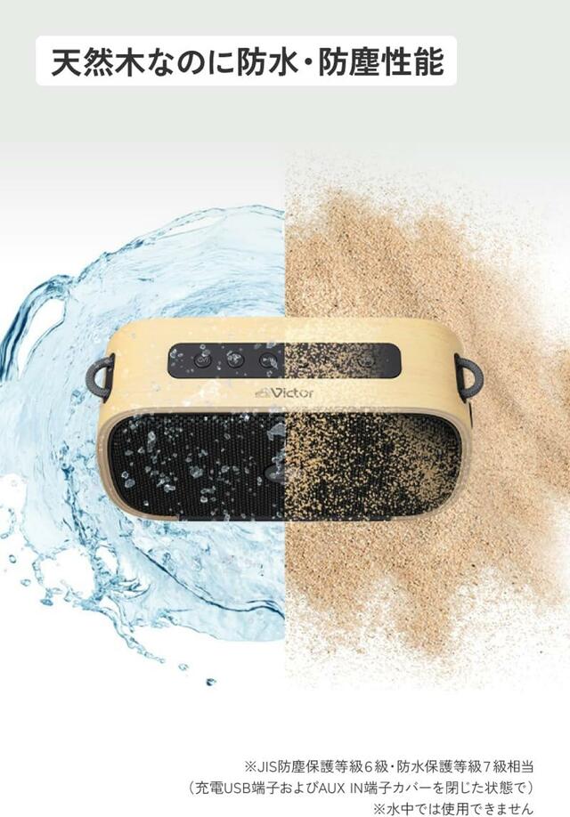 「Victor SP-WS04BT」は木製Bluetoothスピーカーながら、IP67準拠の防水・防塵設計。筐体の表面は撥水コーティングされており、水滴を弾くのでバスルームやキッチン、アウトドアでも安心して使うことができます。