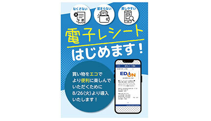 エディオンは8月26日に、来店客の利便性向上と環境負荷の軽減を目的として、レシートを電子化して「電子レシート」での提供を開始する。対象店舗は「エディオン」全店で、エディオンのアプリ会員、「エディオンネットショップ」の登録ユーザーが対象となる。