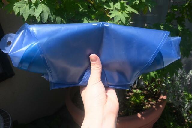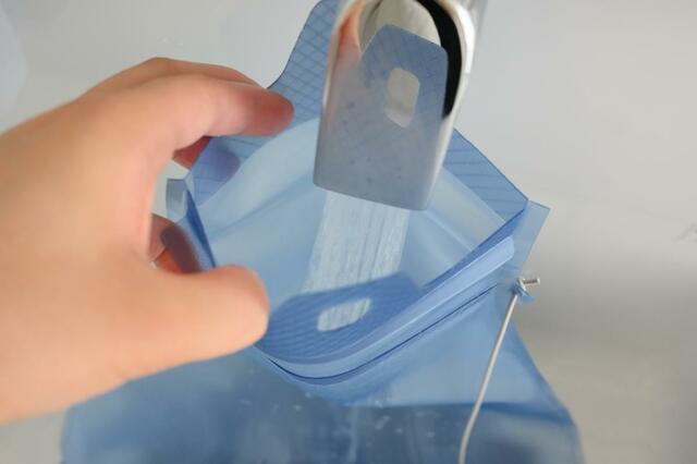 こんなふうに向きを変えて開口部に差し込めば、ぶら下げて乾かせるんです! これなら袋が閉じず空気が入るので、底までしっかり乾かせるというわけ。