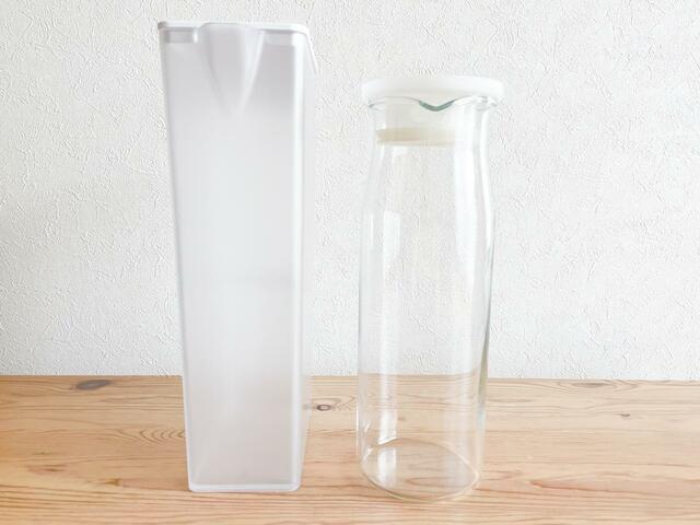 今まで使っていた1Lのガラスピッチャーと並べてみました。背が少し高いけれど、一番広い部分でも厚みは約8.1cmとスリムなつくりです。